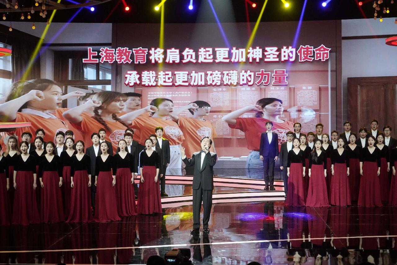 活动尾声,在孔海南、吴於人、范静、侯荷梅四位老师的带领下,上海青年教师代表庄严宣誓,立志忠诚人民教育事业,为民族复兴广育英才。上海音乐学院院长廖昌永带领上海音乐学院师生高歌一曲深情的《理想照耀中国》,活动在激昂的歌声中圆满落下帷幕。