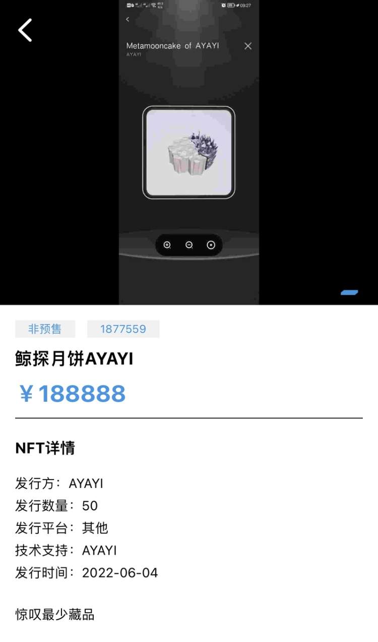 在国内最大的数字藏品社区“XM”中,记者按照价格排序,发现最贵的月饼藏品,几乎都来自一款AYAYI鲸探数字月饼。其中,最便宜的一枚价格为5万元,最贵的一枚甚至被报出了188888元的天价。