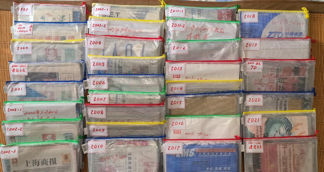 于是,“生日报”的收藏也越攒越多,如今已是满满一整箱。每一年9月20日的报纸都用单独的塑料文件袋分别收藏,右上角还贴上了小小的数字标签。孙金泉说,这个习惯是从2016年开始的:“原本所有的报纸都是整理在书柜里的,突然发现2014年的收藏怎么找也找不到了,这才调整了收藏方式:按年份装袋,用箱子整装。”