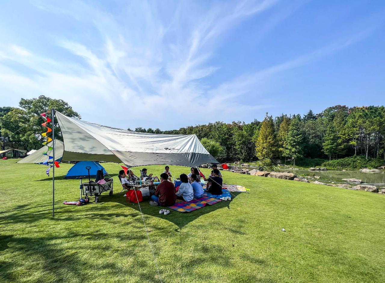 国庆假期,风和日丽。天气虽然有些热但还是有不少市民选择去郊外露营。位于闵行吴泾镇浦江第一湾公园,露营的帐篷是一顶连一顶。