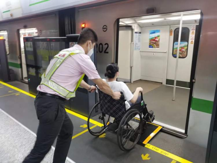 由于站台与列车之间存在缝隙,坐轮椅车的特殊乘客,上下列车时总感觉有点不方便。为此,“无障碍渡板”应运而生。只要有轮椅车乘客提出需求,工作人员到时就会将“无障碍渡板”拿出来,等列车靠站后,将渡板搭设在站台与列车之间,方便坐轮椅车的乘客安全进入车厢(见下面2号线视频)。