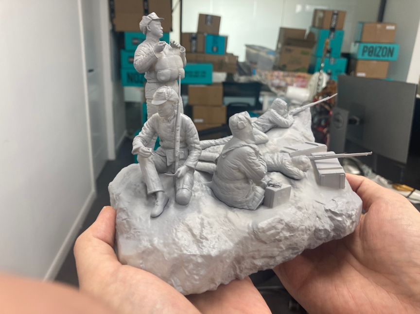 谈及当时的创作背景,朱肖峥眼眶中瞬间透露着坚定的神情。他告诉《新闻晨报》,在这件作品背后还真有一个不为人知的故事:多年前,他曾见过一个韩国的模型爱好者制作出的一件长津湖题材的作品,但因为政治立场的原因,那位模型爱好者颠倒了历史的黑白,抹黑了志愿军的形象。