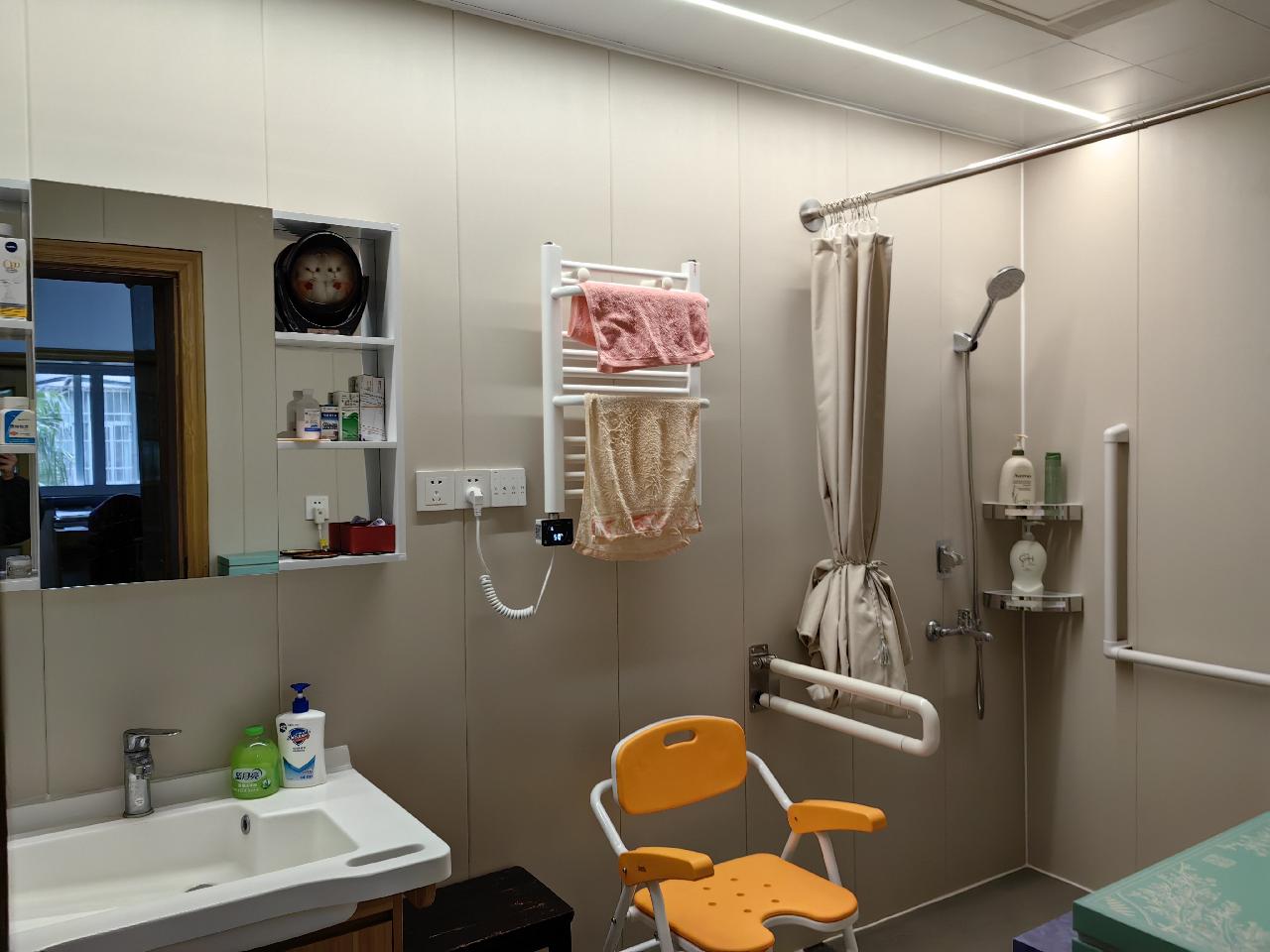 现在卫生间拥有一个空间很大的淋浴区,给老伴洗澡时,他只需要坐着,黄慧丽可以拿着淋浴头自己动,“360°无死角全都能给他洗到了”。
