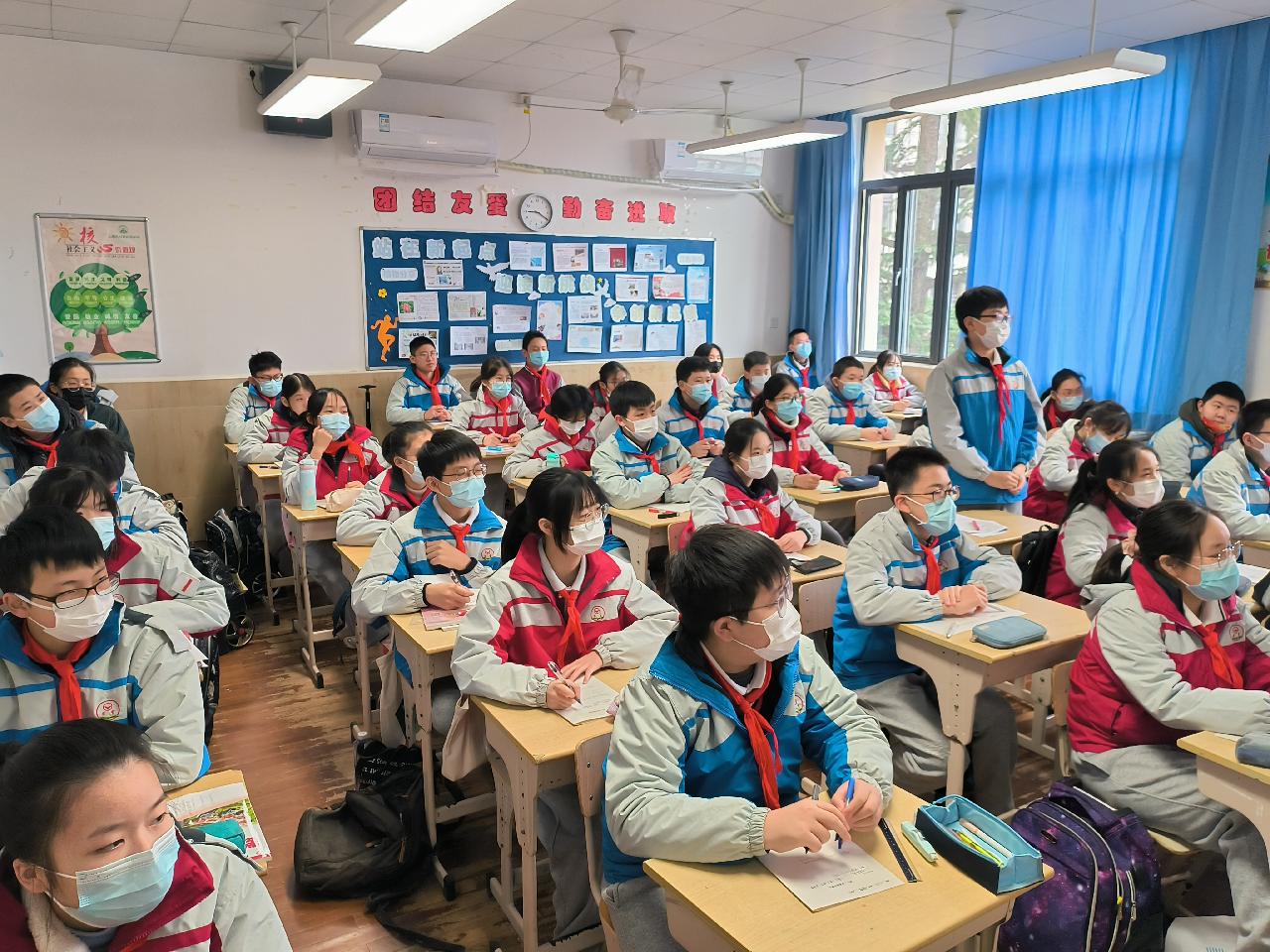 典礼上,袁学佳副校长为行为规范示范班颁发了集体荣誉奖状,队员们则回顾了“汇学习、汇劳动、汇创意”寒假三汇活动。教室里,初二(7)班班主任蔡建芬老师正带领全班同学开展开学第一课。操场上,体育老师倪庆锋带领全校学生上了课间体育课……窗外有风景,手里有课本,眼里有梦想,许久未见的老师和同学们,正在一同重新开启一场愉快的学习之旅。