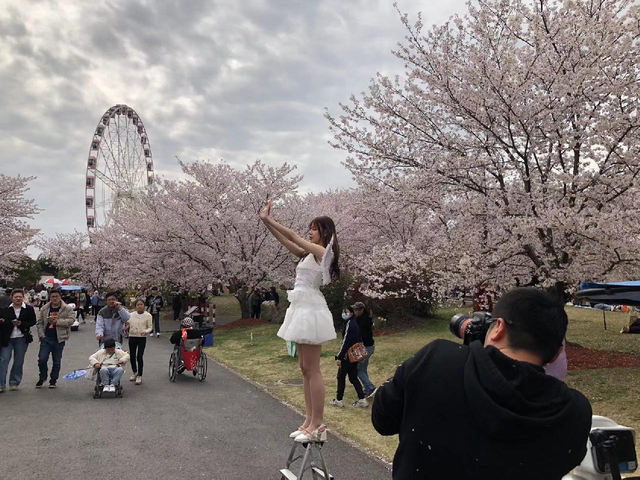 顾村公园园艺园容部经理李勇也非常推崇这个拍摄点位,因为上班时间赶在游客入园前,李勇的镜头里,可以只有樱花与摩天轮共舞的画面。