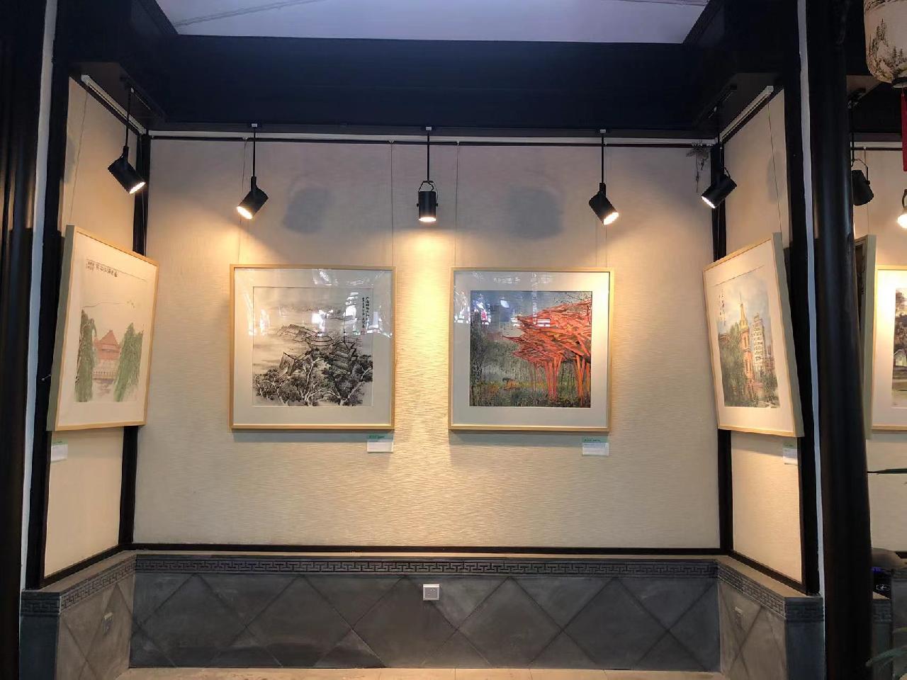 今天,“青绿生态·如画申城”上海画家公园绿地写生作品巡展走进千年名园醉白池,展出了30多幅由一批上海画家通过在公园绿地实地采风后创作的作品。王也良的两幅丙烯画也在其中,一幅描绘了松江中央公园,另一幅描绘了广富林遗址公园。