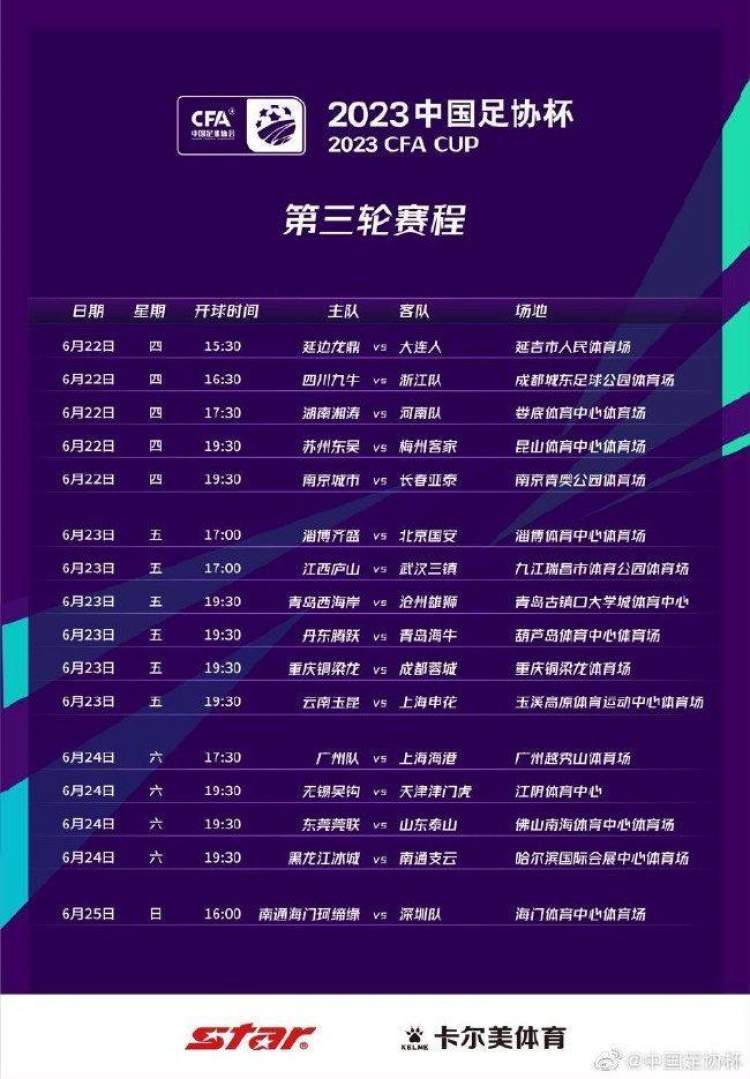 中国足协杯官方6月12日公布了第三轮的赛程,第三轮比赛将于6月22日至25日进行。