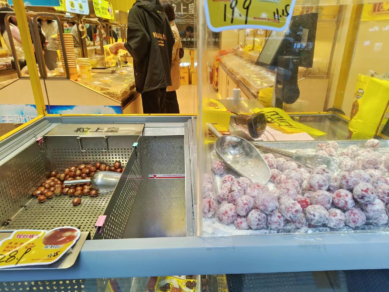 在一家栗子店的招牌上,“糖山楂”和“栗子”的字样十分显目,不少市民正在排队购买。这家栗子店只卖三样产品,分别是板栗、山楂和红薯片。据记者现场观察,15分钟内便有3位市民购买了“板栗+山楂”组合。