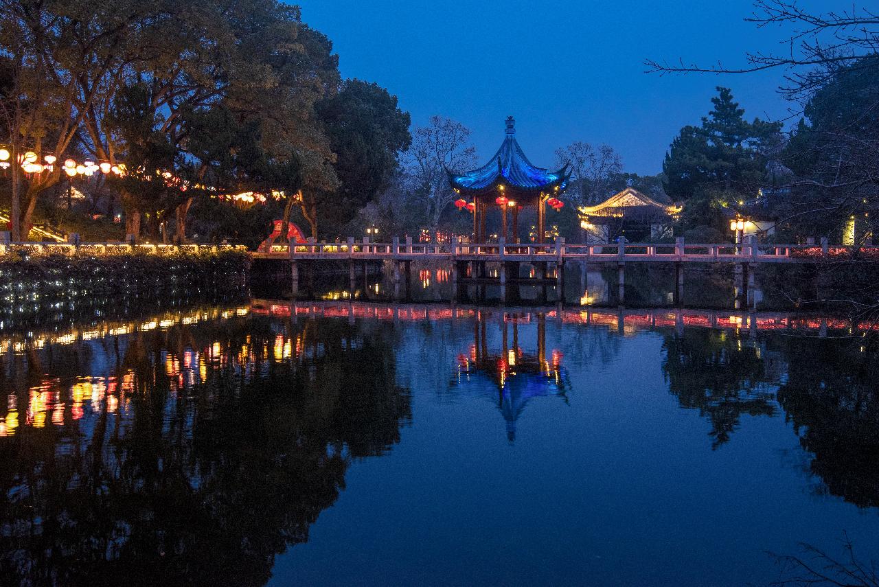 夜晚,走进古猗园,近千只“春花、夏雨、秋月、冬雪”四季传统非遗灯彩亮起,在现代光影艺术的点缀下,营造出“花灯初上”的氛围美感。非遗彩灯中,最具看点当属来自四川自贡的非遗彩灯,有“榴花如丹”、“玉压群芳”、“蟾宫折桂”等景观。