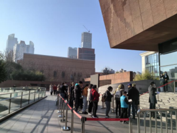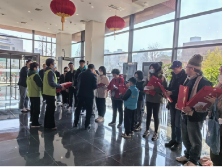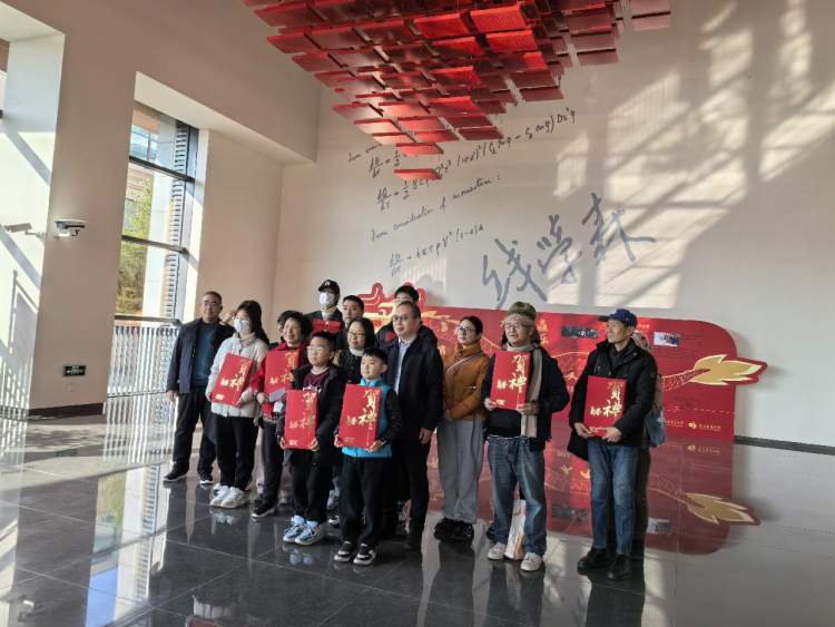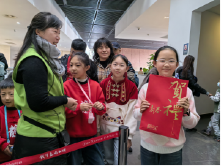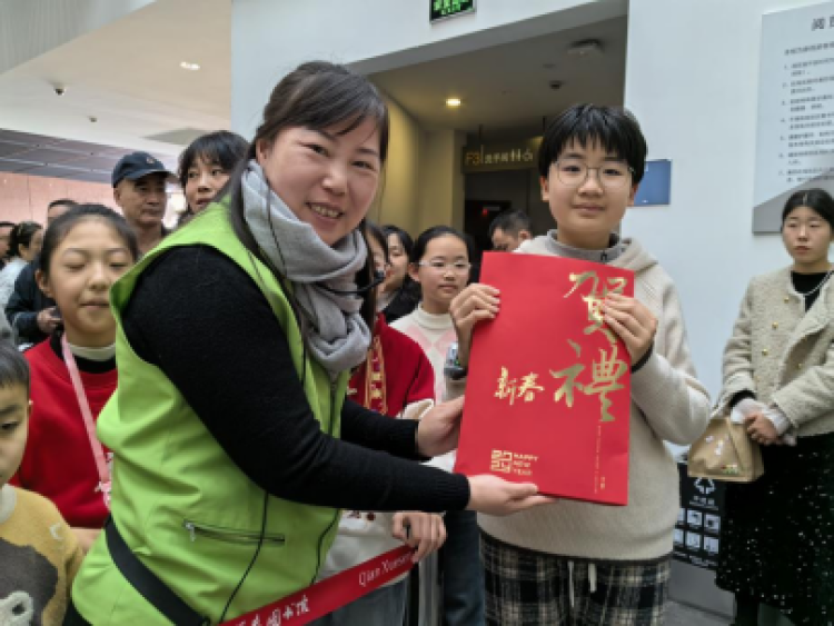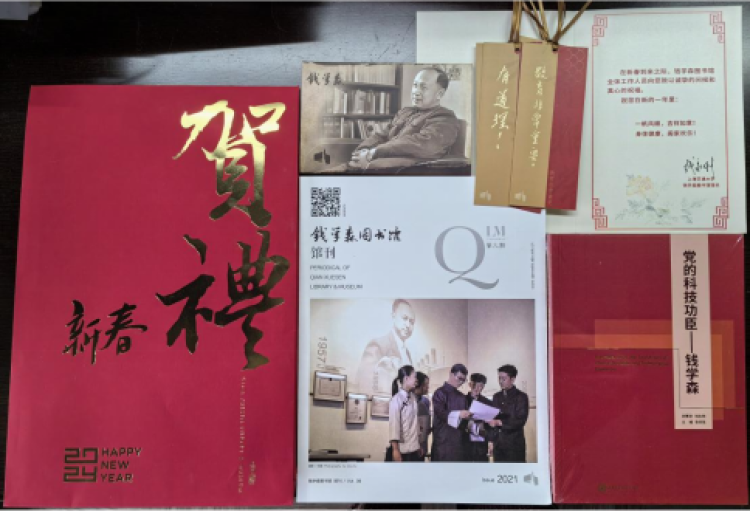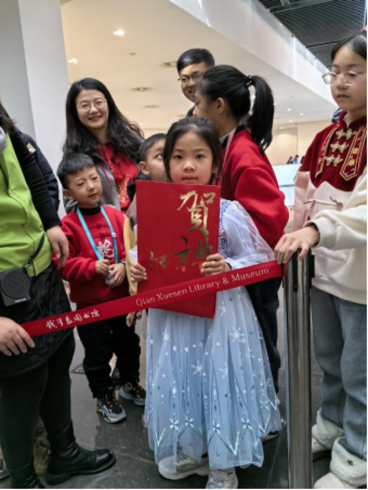一些观众提前半小时到达,排起了队。他们是为了能够抢到入馆前十位,顺利拿到新春盲盒大礼包。礼包内含钱学森图书馆出版的钱学森读物、最新一期钱馆馆刊、定制明信片以及龙年新春的定制书签,并会随机出现由钱学森之子、钱学森图书馆馆长钱永刚亲签的珍贵新春贺卡。