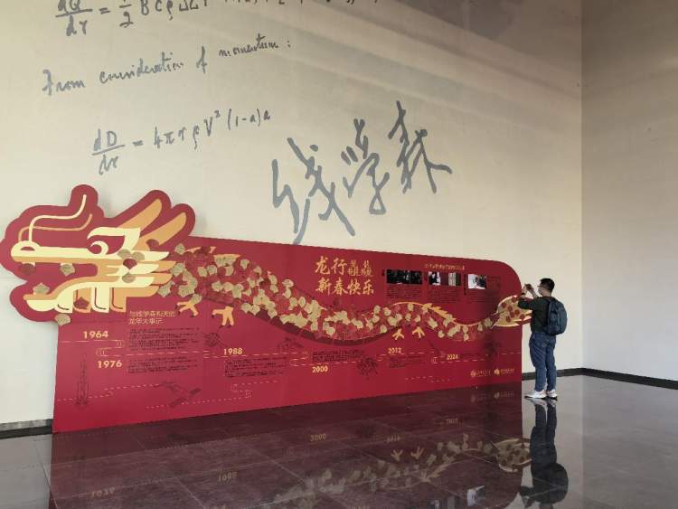 有些观众在领便签纸,贴“龙鳞”。有的在观看展板。展板展示了与钱学森相关的龙年大事记以及钱学森的春节故事。