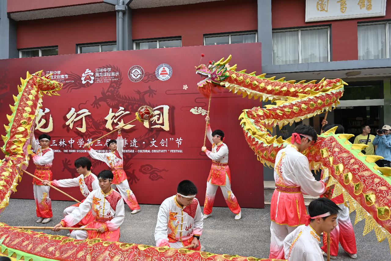 上海三林素有“舞龙之乡”的美誉,是 “浦东绕龙灯”国家级非遗的发祥地。三林中学舞龙的“星星之火”,从兴趣社团到特色课程,逐步发展到具有“非遗∙文创”特色的三类舞龙课程,在近二十年的教学探索中,收获了丰硕的果实。龙腾狮跃,热闹非凡,近日,一场“走近非遗文创 弘扬传统文化——基于“双新”的民族民间传统体育教学实践展示活动”在上海市三林中学举行。