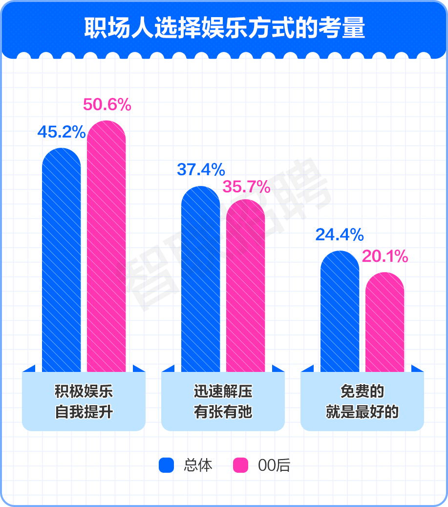 针对职场人业余时间的娱乐选项,智联招聘进行了深入探寻。看似随意的娱乐选择背后,藏着职场人对人生的期许。超4成职场人偏爱积极娱乐,在享受生活的同时进行自我提升。年轻的00后们是“脑容量充足”的一代,过半都喜欢“边玩边学”。
