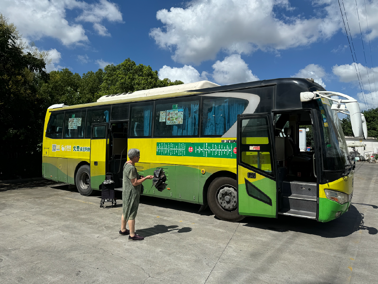 不久后,其中几名阿姨下了车,另一名阿姨提着买菜的推车上了大巴,和车上的阿姨伯伯们打了一声招呼,并加入了聊天的行列。