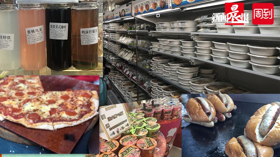 在用餐区,许多市民围桌而坐,吃泡好的方便面或加热好的盒饭、饭团和三明治。记者注意到,盒饭品种包括咖喱鸡排饭、咖喱猪排饭、鸡腿饭、照烧鸡排双拼饭,价格在20到25元,然后还有各种饭团,价格都为10元,三明治价格在10到13元左右,面条品种也很丰富,有意面、炸酱面、鸡丝冷面、港式餐蛋面,价格都为15元。烧烤在8到12元之间,而关东煮为10元5粒,包括港式鱼豆腐、台式花枝丸、港式龙虾风味丸和牛筋丸等。