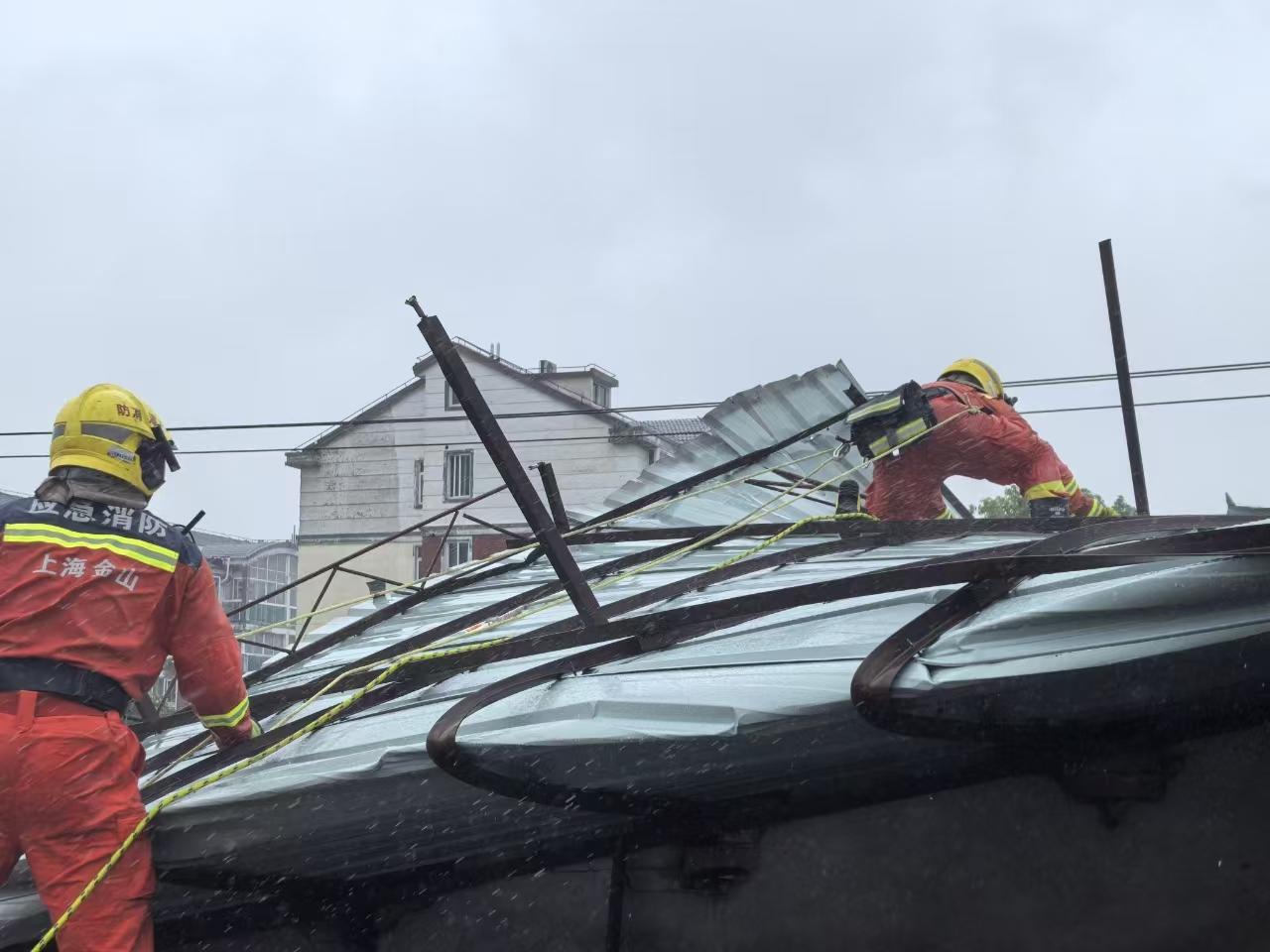 9月16日11时07分许,金山区亭朱公路515号汽车修理厂2楼屋顶彩钢板被吹翻。金山区消防亭林消防救援站接报赶赴现场处置。到场后,利用绳索对彩钢板进行加固,完毕后移交民警报返队。