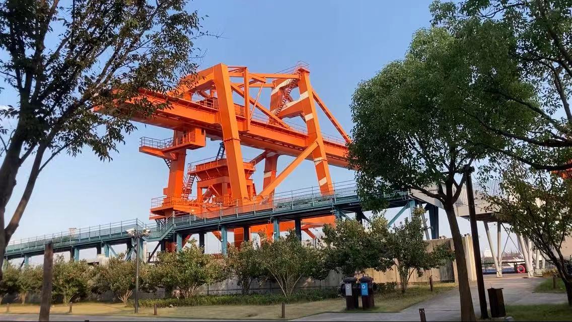 公园里最出片的地方,除了两个大烟囱之外,就是亮眼的起重机。从党群服务站二楼平台可以直接走到起重机下。两台橙色的起重机,不但将工业风拉满,还能360度全方位拍摄,在浦江和蓝天的映衬下,格外提神。被誉为“上海最具工业风的出片圣地之一”。