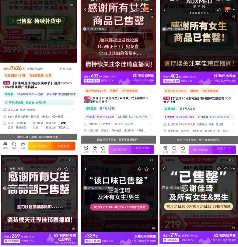 据统计,李佳琦直播间双十一加购金额同比增长超过20%。预售首日晚8点开启后,在不到两小时内,可复美、瑷科缦、绽媄娅、双妹、诚实一口、蓝氏等国货品牌产品在上架后后迅速售罄。