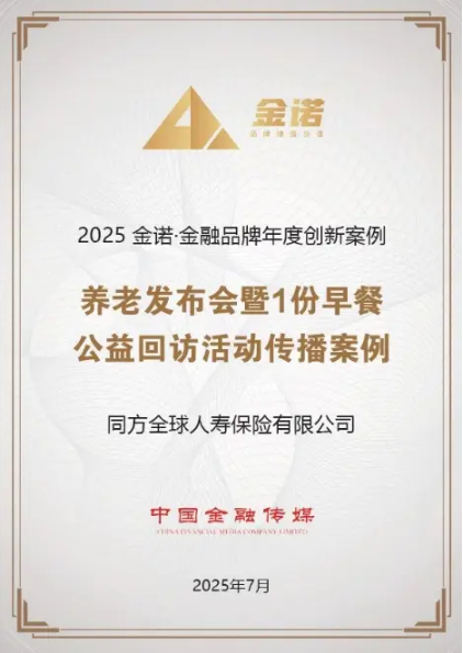 近日,由《中国银行保险报》主办的“2025金诺·金融品牌年度影响力案例”榜单揭晓,同方全球人寿凭借“中国居民退休准备指数调研报告发布会暨1份早餐公益回访活动传播案例”,荣获“金诺·金融品牌年度创新案例”。